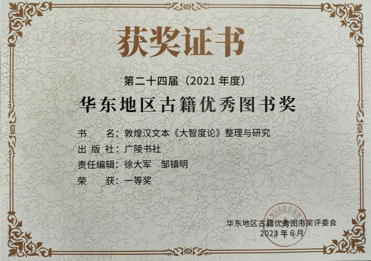 刘显教授著作《敦煌汉文本<大智度论>整理与研究》2023年荣获第二十四届华东地区古籍优秀图书一等奖