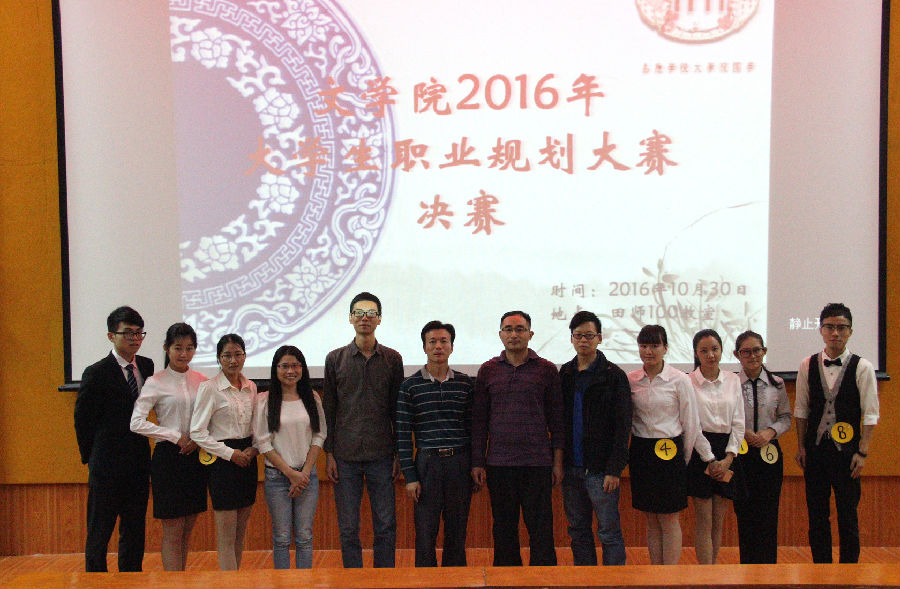 10月30 日下午,文学院2016年大学生职业规划大赛决赛在田师100举行。比赛邀请教务处实践科杨仕立科长、招生就业处王涛科长及文学院三位辅导员老师担任评委。