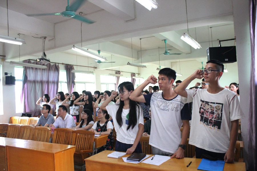会议在庄重的国歌中拉开序幕。黄兆锋老师宣布了第八届团学干部名单并表示祝贺。随后,团总支书记廖淑婷带领第八届团学干部们进行了就职宣誓。接下来,党总支曾桓辉书记发表讲话。他希望团学干部们在工作中能够处理好师生关系、同学关系、工作与学习的关系,并着重指出工作与学习的关系处理尤为重要,学生应该以学业为重,只有先搞好学习,才能更好地为同学们服务。其后,刁清利老师用八个字概括了她对干部们工作的要求——模范、效率、锻炼、提升,即希望干部们能够起模范作用,有效率地进行工作,并在团学工作中锻炼和提升自己。最后,新任的六位团学常委分别上台发言,委员们希望干部们可以尽快转换角色,定好位,坚守好自己的角色。干部们要秉承着“专业、敬业、服务”的宗旨为文学院、为同学们服务,并在工作中不断前进、不断成长。