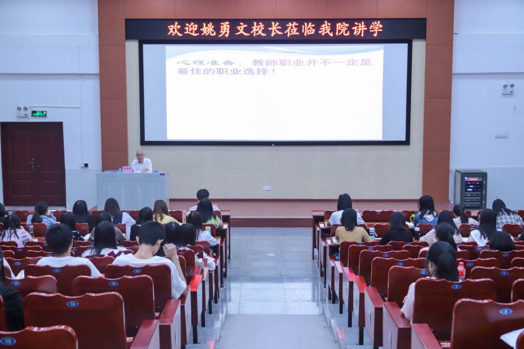 为提高我院师范生的教师职业认同感和语文教学能力,我院邀请了梅州市东山中学高三校区姚勇文校长开讲,讲座于11月6号晚在文科楼107举行,讲座由陈红旗院长主持。本次讲座也是我院“语文教学设计与教师素质培养”系列讲座的第三讲。我院17级师范生及“卓越语文教师培养班”同学聆听了本次讲座。