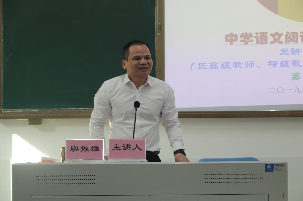 为提高文学院师范生的教学基本功和培养语文学科专业核心素养,我院邀请了兴宁市第一中学副校长、正高级教师廖振雄老师开设了题为“中学语文阅读教学设计与实施”的讲座。讲座于11月30日下午在文科楼311举行,由陈红旗院长主持。本次讲座也是我院“语文教学设计与教师素质培养”系列讲座的第五讲。我院17级师范生及“卓越语文教师培养班”全体学员聆听了本次讲座。