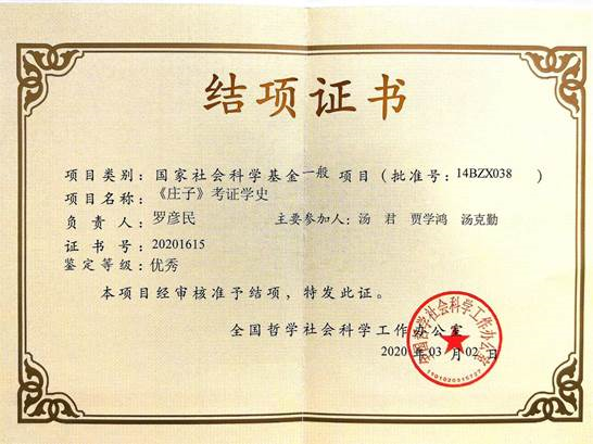 据全国哲学社会科学规划办公室公布国家社会科学基金结项情况公告,经过专家匿名评审鉴定和全国哲学社会科学规划办审批结题,我院罗彦民博士、副教授主持的《<庄子>考证学史》(项目编号:14BZX038)被评定为“优秀”等级。
