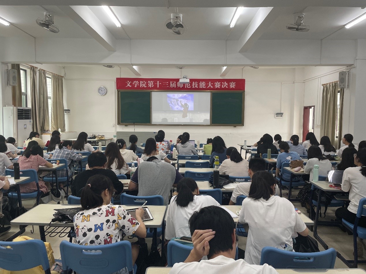 本次活动主要分为三个阶段进行。我院主要观摩了第二阶段的现场授课环节。组委会在第一阶段比赛结束后公布授课的课题——《壶口瀑布》,参赛选手进行同课异构的比拼。在赛场上,选手们各显其能,课堂比拼各具特色,有声情并茂者,娓娓动听;有匠心设计者,环环相扣,层层深入;有谆谆引导者,循循善诱,攻艰克难。教师们都充分展现对课标的理解,立足学生主体,同学们也沉浸其中,学习 “如何上好一节语文课”。第三阶段为点评总结环节。活动特邀嘉应学院文学院语文课程与教学论古晓君老师进行点评。古晓君老师从“教学原则、教材、文本、学情”四个方面对教师们的课堂展示情况进行了评价,并建议青年教师要密切关注课标教材的变与不变,寻求如何从碎片化教学的传统教学理念转向主题教学的新课标理念。