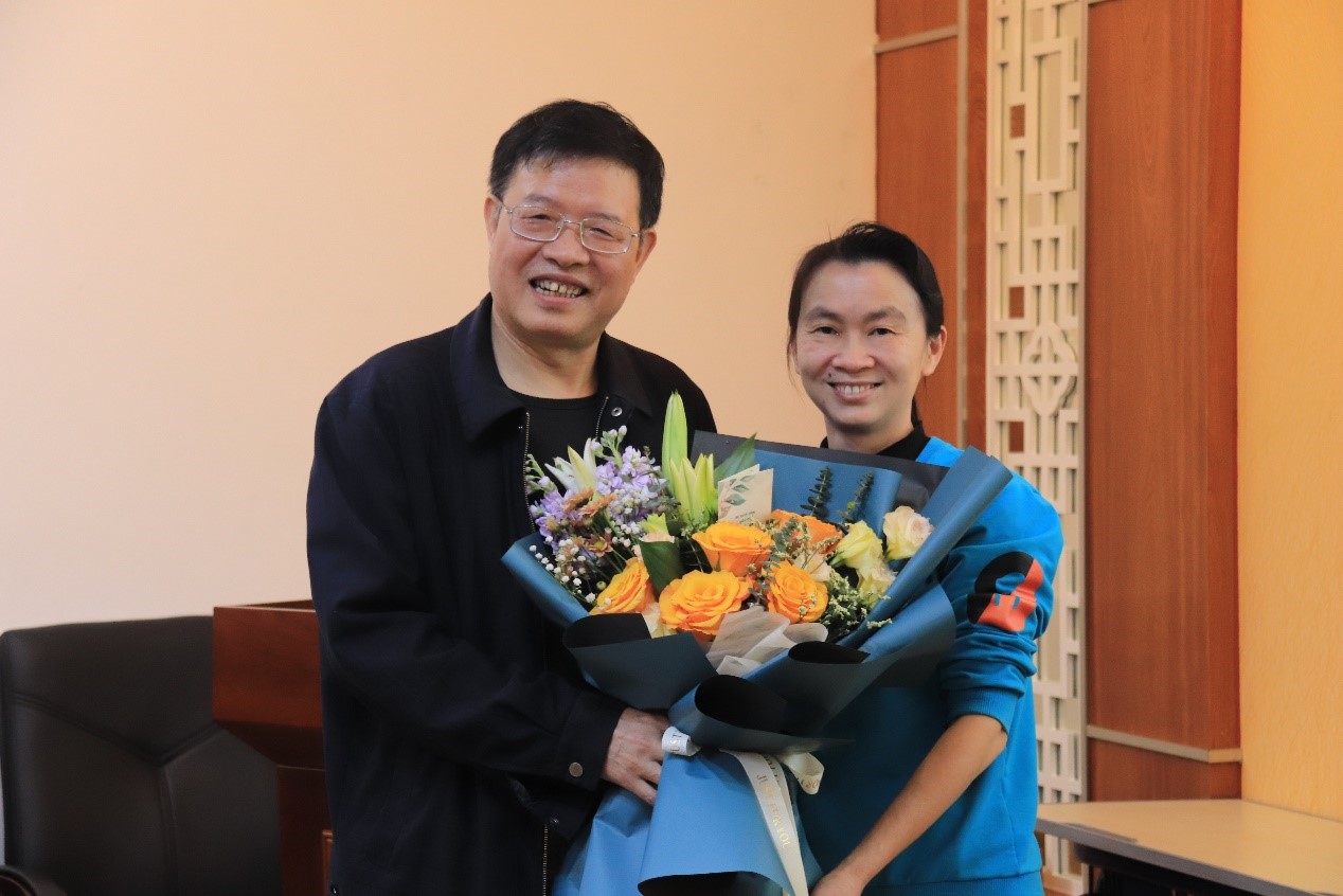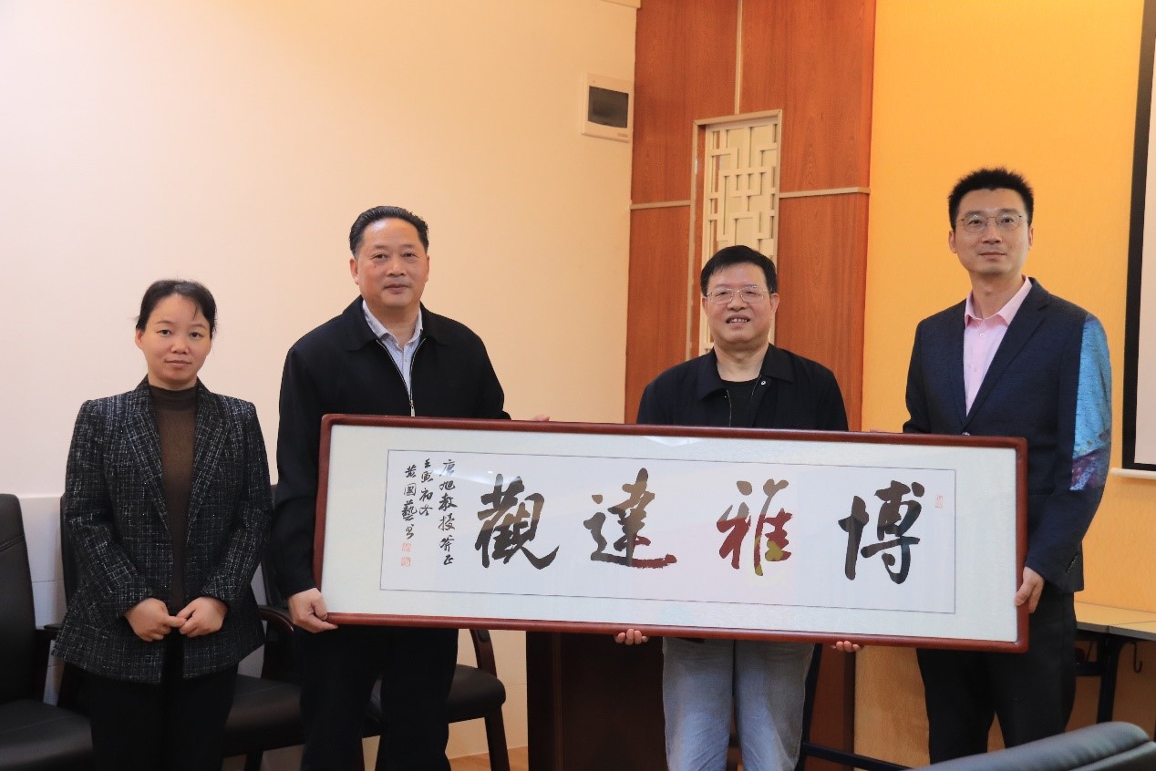随后,我院现当代文学教研组主任房利芳代表我院献上鲜花和祝福,学院领导为唐旭老师献上字画“博雅達觀”并合影留念。