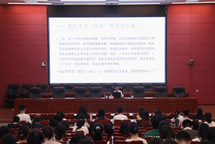 讲座伊始,管仲乐介绍了苏轼生前“坡仙”称谓形成的原因。管仲乐提到“仙”这一称谓主要源自道教,接着引用史料向同学们说明了宋代理学兴起和统治阶层对于道教的密切支持,因此道教得到了快速发展并出现了一批以“仙”为名的文人士大夫。同时期苏轼的许多称谓也因此与“坡仙”息息相关,如玉堂仙、玉局老、苏玉局、玉局翁等等。
