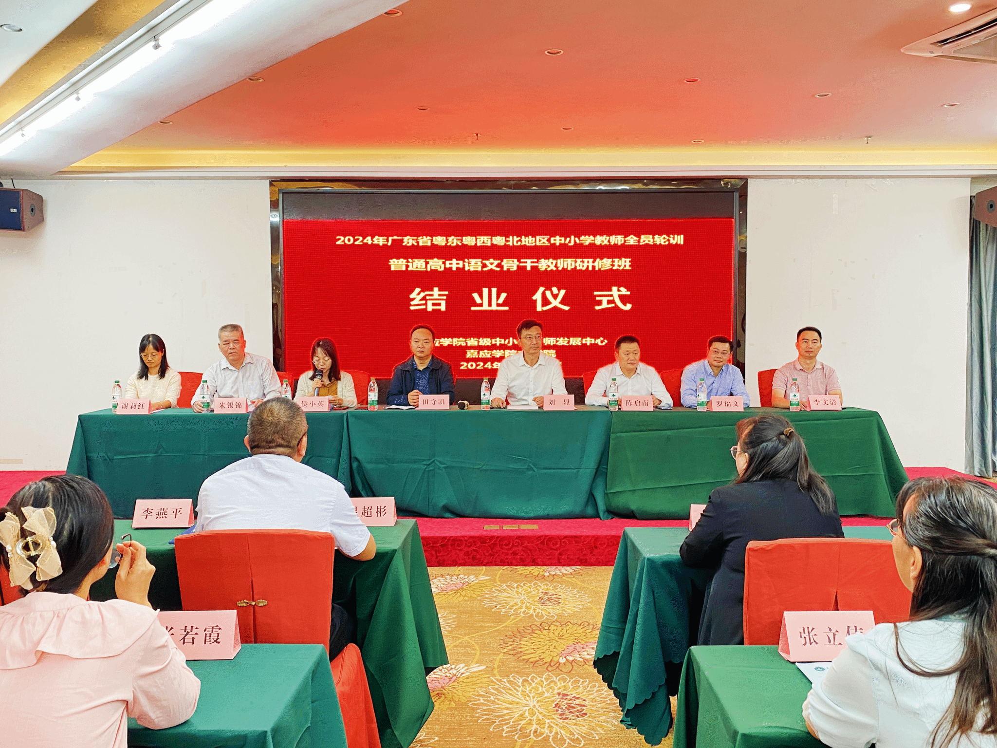 2024年10月25日,2024年广东省粤东粤西粤北地区中小学教师全员轮训项目普通高中语文骨干教师研修班研修活动圆满结束并举行了隆重的结业仪式。嘉应学院文学院院长、培训项目负责人、首席专家刘显教授,嘉应学院省级中小学教师发展中心田守凯副主任,嘉应学院文学院侯小英副院长,梅州市教师发展中心陈启南副主任,梅州市教师发展中心中学语文教研员罗福文老师、李文清老师,培训班教学班主任、嘉应学院文学院朱银锦老师,培训班生活班主任、嘉应学院文学院谢莉红老师莅临现场。结业仪式由侯小英副院长主持。