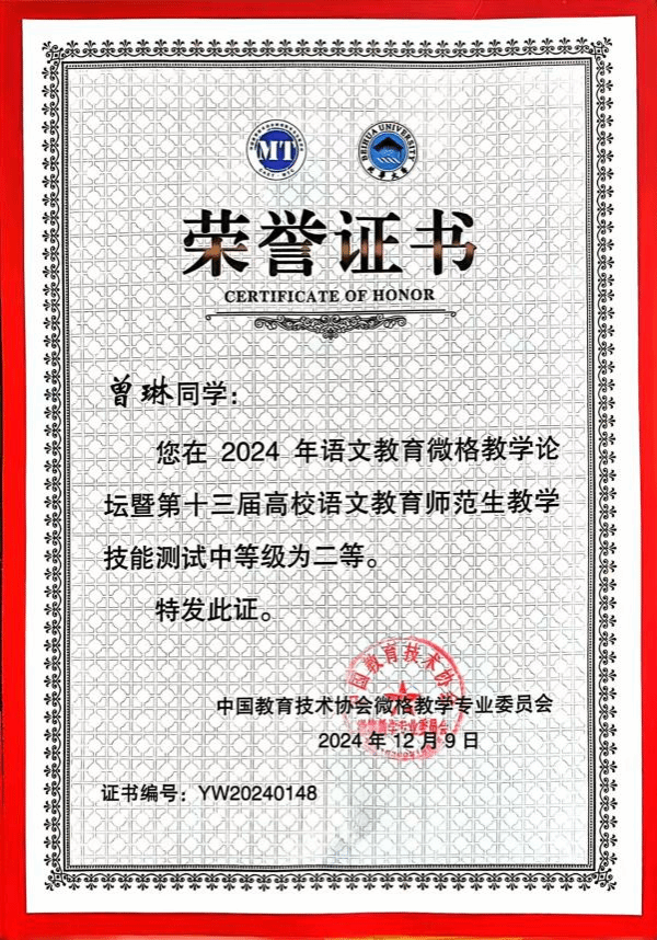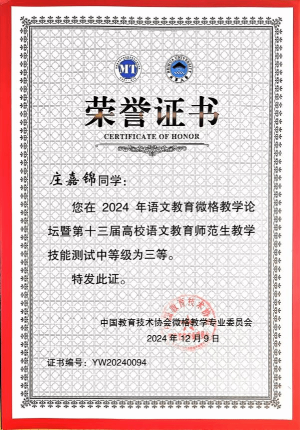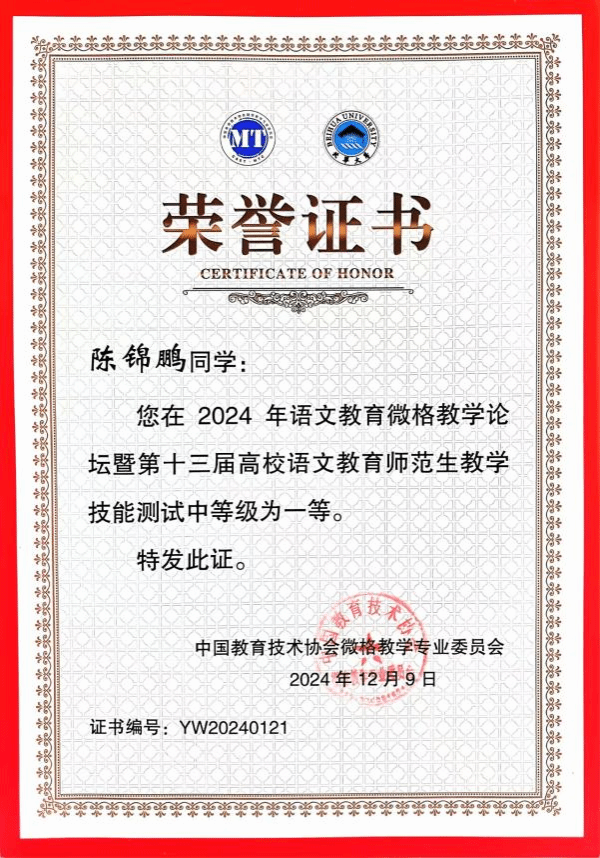 在参赛过程中,我院选手发挥稳定、表现突出,以精彩的呈现得到评委的高度认可,给观赛师生留下了深刻印象。最终,在语文教育师范生教学技能测试中,陈锦鹏获一等奖,曾琳获二等奖,李文君和庄嘉锦获三等奖。
