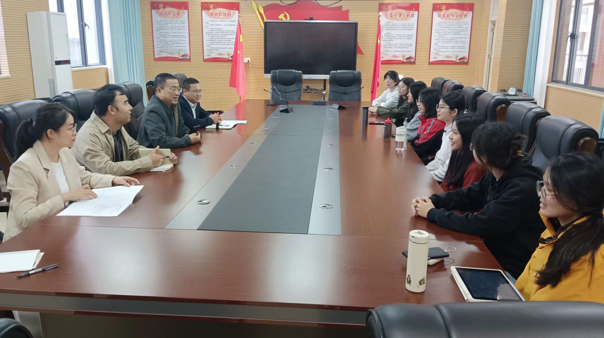 在四校分别召开的座谈会上,各校党委书记、校长、教务主任、指导教师代表对实习生的专业素养、教学态度及成长轨迹给予客观评价,并表示,实习生的到来,为学校增添了活力,在指导学生的过程中更是感受到传帮带不仅是技能传递,更是教育热忱的传承。丰顺县大同学校的廖伟颂老师特别为实习学生创作了一首七律诗,以独特的方式表达对实习生的认可与鼓励。此外,调研组还围绕实习学校近年对中学语文教师的人才需求与招聘情况,以及文学院汉语言文学专业(师范类)在人才培养目标合理性、毕业生能力素养是否契合用人单位需求等方面,通过访谈、座谈等形式展开了深入调研。