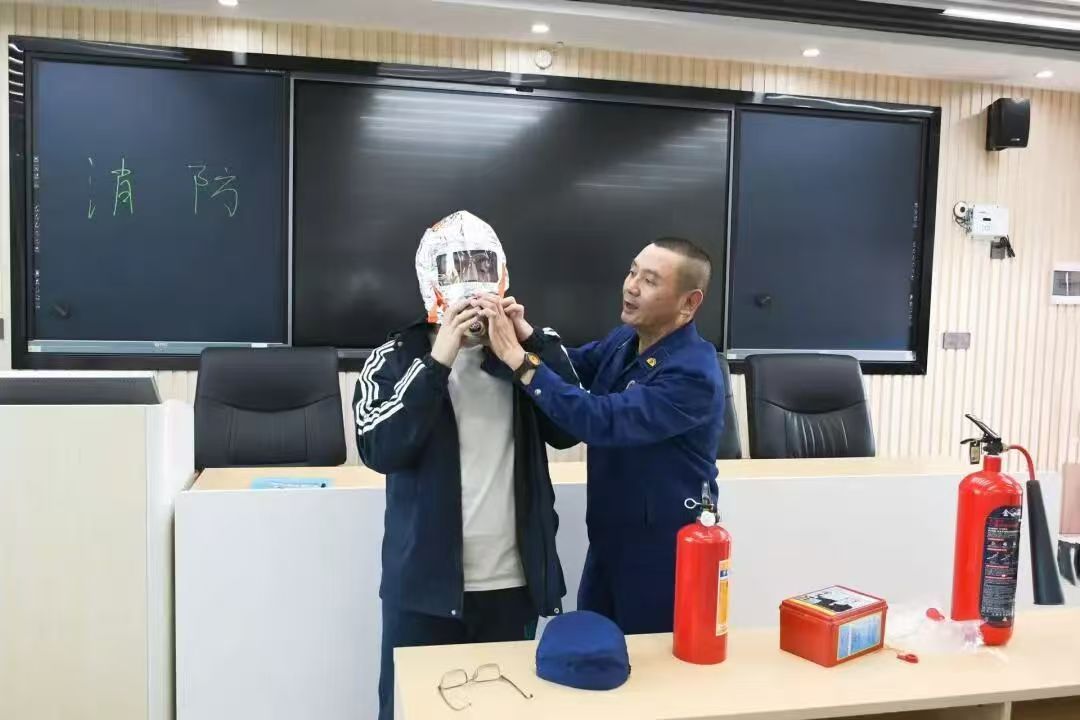最后,消防员为大家系统讲解了灭火器、消防栓、防火毯、防毒面具等常用消防器材的识别要点与使用方法。在讲座中还请了同学上台试验,为他详细讲解了灭火器“拔销、握管、对准火焰根部、喷射”的标准操作方法。最后又补充了火灾逃生时低姿匍匐前进、湿毛巾捂住口鼻、优先选择楼梯疏散等关键技巧,同时普及了应急报警的规范流程、自救互救的基本方法,以及消防安全疏散演练的组织实施要点与常见问题应对策略。