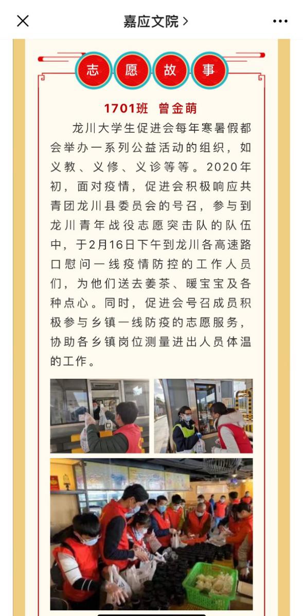 阳春三月,春风送暖,在全国高校线上学雷锋活动开展的如火如荼期间,嘉应学院文学院实践部响应号召,以“寻雷锋足迹,扬志愿精神”为主题,于2020年3月22日在文院公众号、易班等网络平台举行线上雷锋月活动。充分利用互联网的时效性传播,创造性开展各项活动,如制作微信公众号推文、暖心小视频等。