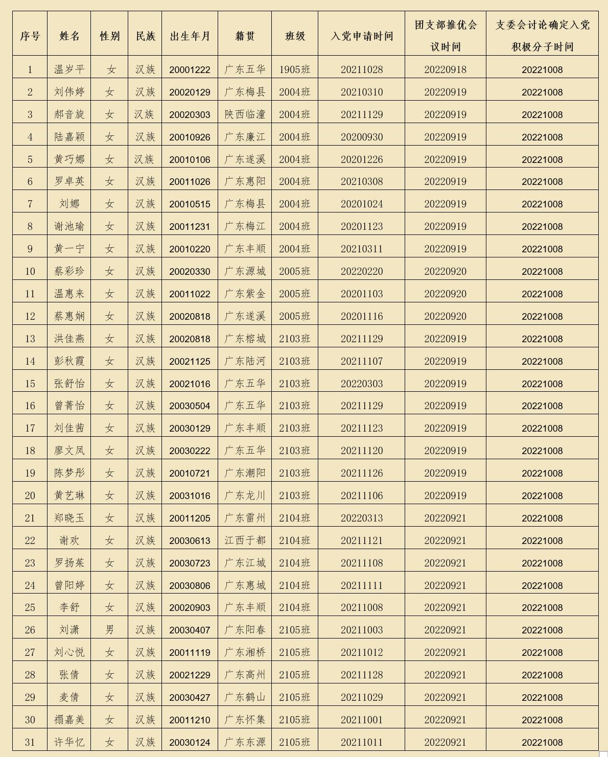 按照发展党员工作有关规定,根据群团组织推优情况,经支部委员会研究,确定温岁平等31名同志为入党积极分子。现将有关情况公示如下: