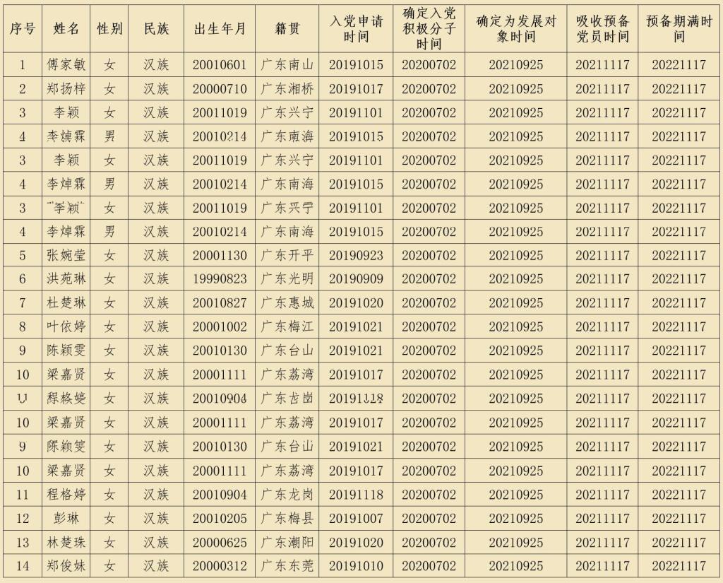按照发展党员工作有关规定,在听取党小组和党员、群众意见的基础上,经党支部委员会审查,党支部拟于近期召开党员大会讨论将傅家敏等14名同志转为中共正式党员,现将有关情况公示如下: