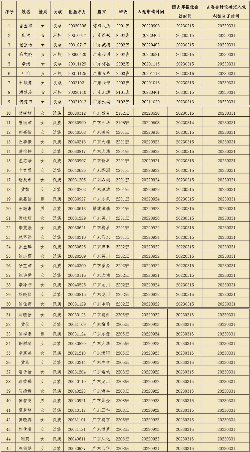 按照发展党员工作有关规定,根据群团组织推优情况,经支部委员会研究,确定吉金茹等45名同志为入党积极分子。现将有关情况公示如下:
