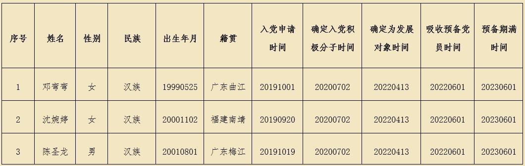 按照发展党员工作有关规定,在听取党小组和党员、群众意见的基础上,经党支部委员会审查,党支部拟于近期召开党员大会讨论将邓弯弯等3名同志转为中共正式党员,现将有关情况公示如下: