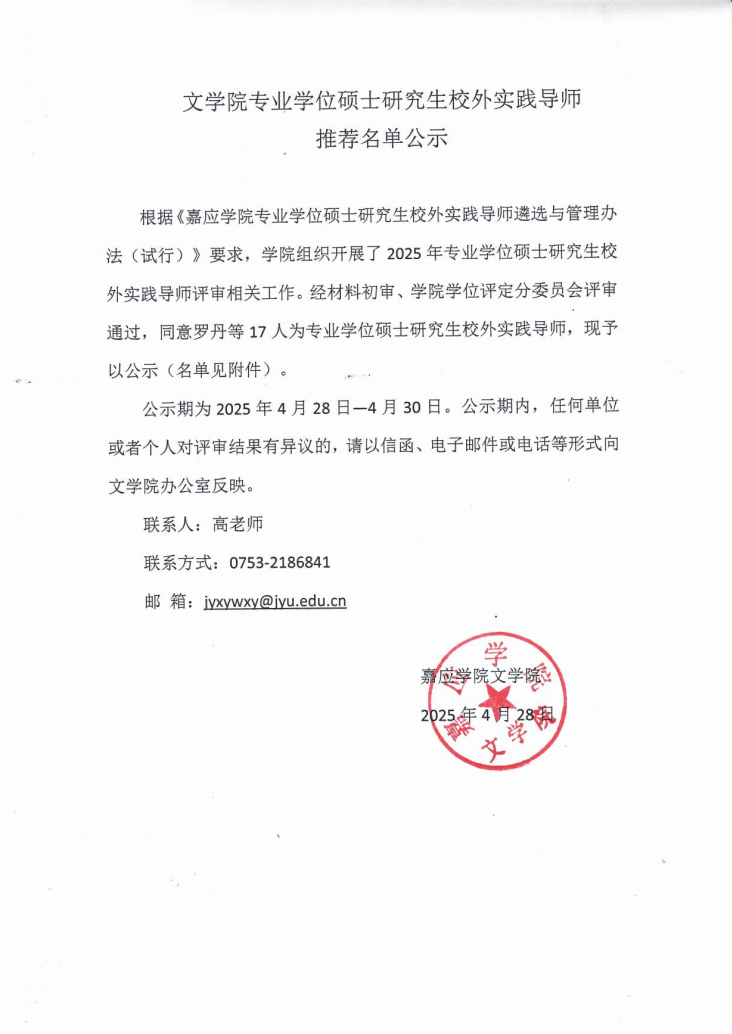 文学院专业学位硕士研究生校外实践导师推荐名单公示